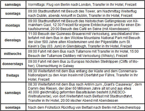 Flug Berlin/London/Dublin*, Flug Belfast/London/Berlin*, Minibus/Bus**